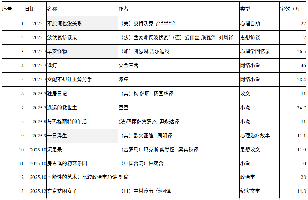 这份年度书单,正是为这样的相遇而准备。书单里的每一本,都经过反复斟酌与甄选。它们之中,有些能带你潜入从未抵达的思想深海,探索认知边界;有些则像老朋友般在你耳边轻声诉说,抚慰心灵。愿这些书能陪你走过四季晨昏,在每一个需要陪伴或启发的时刻,为你点亮一盏灯。现在,让我们打开读者王旭玲的年度书单,聆听她的阅读心声,共享这份文字里的感动与收获。