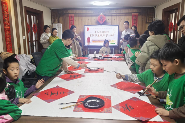 10月25日上午,青岛市图书馆带领小读者们走进康有为故居,开展“童笔绘重阳 墨香满故居——重阳节主题研学活动”。活动中,康有为故居的工作人员为大家生动讲述了晚清历史背景、近代不平等条约签订的影响以及康有为的生平事迹、与青岛的深厚渊源等,细致解读了其书法作品的艺术特色与思想内涵。书法体验环节,图书馆阅读推广人肖老师带领小读者们朗读了康有为为母亲书写的贺寿对联,深入阐释其中承载的孝亲敬老传统。随后,小读者们学以致用,一起书写康体 “寿” 字,在笔墨挥洒间体悟传统文化魅力。