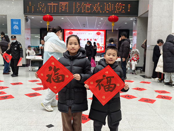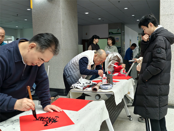 活动现场,墨香氤氲,红宣铺展,书法爱好者们凝神运笔,行云流水,一个个笔墨饱满“福”字跃然纸端;读者们围拢四周,依次接过飘着墨香的“福”字,并与现场心仪的“马上有福”等合体字书法作品合影留念,脸上洋溢着幸福的笑容。