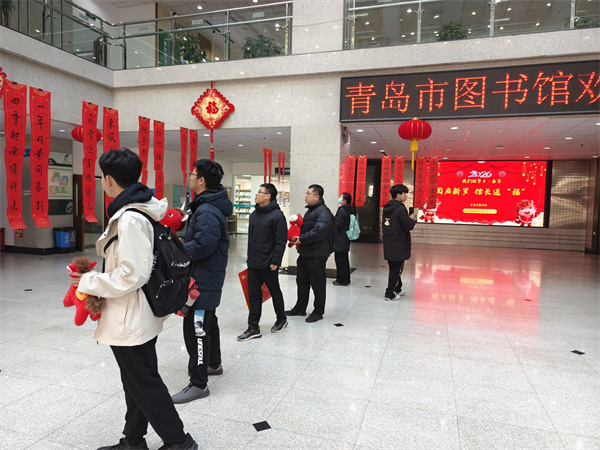 丙午新岁,万象更新。正月初一,青岛市图书馆内灯笼高悬、窗明几净、书架井然、墨香氤氲,处处洋溢着喜庆祥和、文韵悠长的节日氛围。上午九点整,青岛市图书馆馆长带领工作人员在二楼服务大厅迎接新年首批读者的到来,向大家致以马年新春的美好祝福,并送上精心准备的马年吉祥物。以书香为礼、以文化传情,祝福广大读者在新的一年以阅读启智润心、以书香涵养品格,在墨卷相伴中笃行向上、奔赴新程。同时致谢社会各界与读者朋友长期以来对图书馆事业的支持与厚爱。