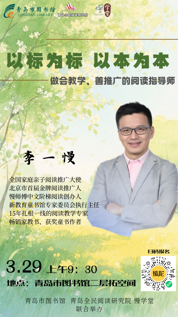 本讲座特邀全国家庭亲子阅读推广大使、北京首届金牌阅读推广人、新教育童书馆专家委员会执行主任——李一慢老师做客“青岛文化大讲堂”,围绕《3-6岁儿童学习与发展指南》与《义务教育语文课程标准(2022年版)》,聚焦绘本教学与小学生整本书阅读两大核心领域,通过书籍示范与实操讲解,为广大阅读推广从业人员和爱好者提供可落地、可应用的阅读教学方法与推广策略。