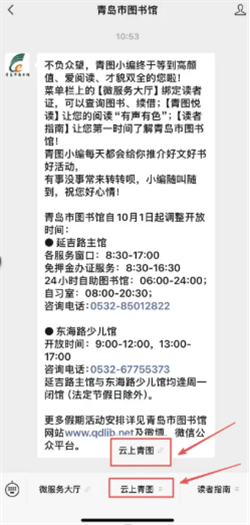 1.关注【青岛市图书馆】微信公众号,点击下方菜单栏【云上青图】→选择【新语听书】,进入听书活动;