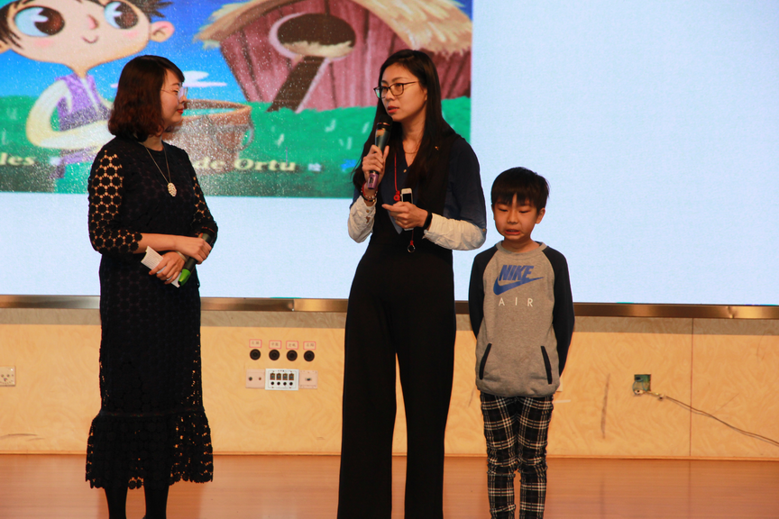 第一期学员代表孟颢天及他的母亲上台展示学习成果和经验分享