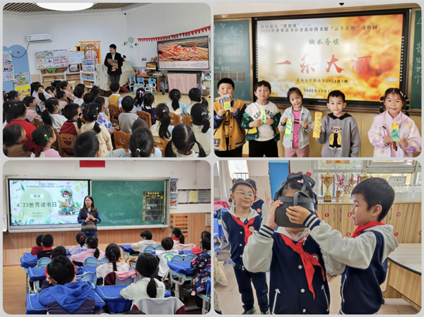 服务宣传周期间,青岛市图书馆“云上青图”数字资源活动品牌走进岛城多所校园,开展主题阅读活动。在青岛市实验幼儿园、太平路小学开展绘本《一条大河》导读活动,以馆藏数字资源“贝贝国学数据库”里的动画视频开场,与孩子们一起阅读中国原创绘本《一条大河》,并推荐馆藏数字资源中与黄河有关的内容;在大学路小学、青岛市实验小学开展世界读书日主题活动,结合馆藏数字资源,带孩子们了解世界读书日的来历、习俗和版权、侵权等知识;在青岛市实验小学开展“衣物收纳小达人养成记”主题活动,通过“云上青图”数字资源学习衣物收纳知识并进行实操。活动现场,馆员们带来的VR眼镜也让孩子们有了沉浸式的阅读体验,在《千里江山图》的虚拟场景里感受科技与文化的深度交融。
