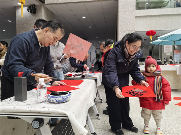 活动现场,墨香氤氲,红宣铺展,书法爱好者们凝神运笔,行云流水,一个个笔墨饱满“福”字跃然纸端;读者们围拢四周,依次接过飘着墨香的“福”字,并与现场心仪的“马上有福”等合体字书法作品合影留念,脸上洋溢着幸福的笑容。