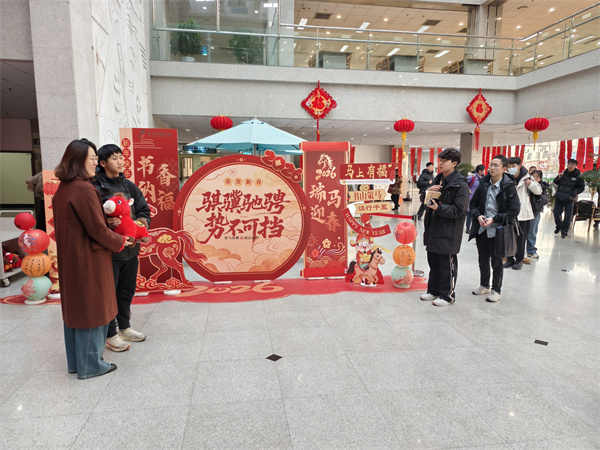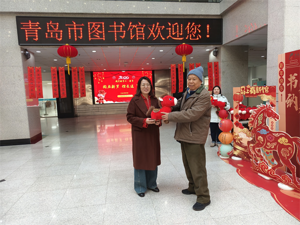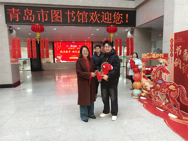丙午新岁,万象更新。正月初一,青岛市图书馆内灯笼高悬、窗明几净、书架井然、墨香氤氲,处处洋溢着喜庆祥和、文韵悠长的节日氛围。上午九点整,青岛市图书馆馆长带领工作人员在二楼服务大厅迎接新年首批读者的到来,向大家致以马年新春的美好祝福,并送上精心准备的马年吉祥物。以书香为礼、以文化传情,祝福广大读者在新的一年以阅读启智润心、以书香涵养品格,在墨卷相伴中笃行向上、奔赴新程。同时致谢社会各界与读者朋友长期以来对图书馆事业的支持与厚爱。