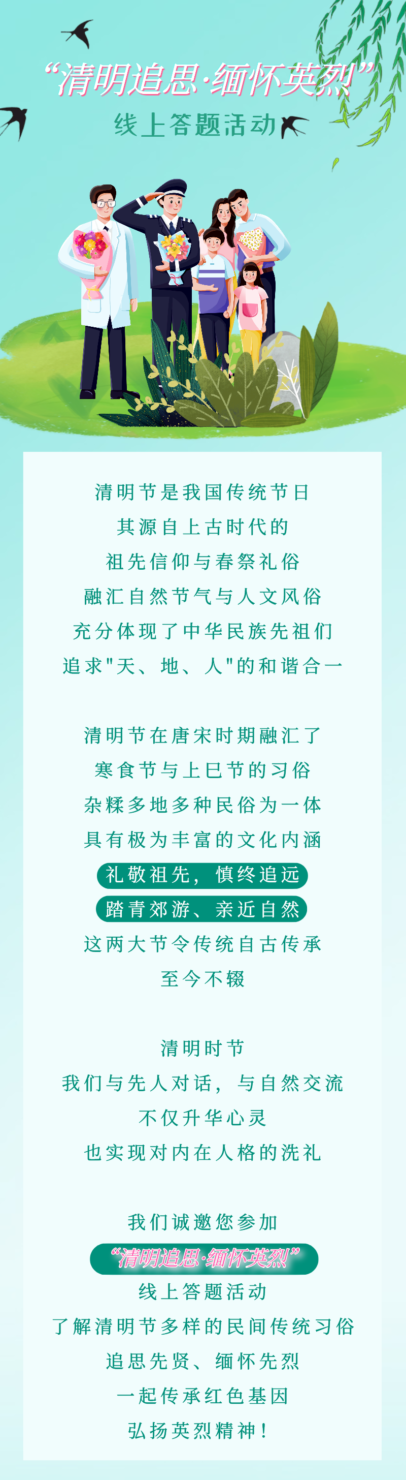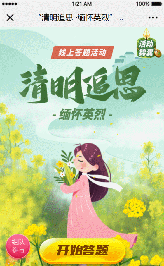【清明追思 ·缅怀英烈】 线上答题活动 所有读者均可参与 2021 年 4 月 2 日8:00-4 月 12 日24:00 (扫码即可参与) (1) 本次活动题目为选择题,有 A、B、C 三个选项,每题 10 分,满分为 100 分, 每道题 30 秒; (2) 每人每天不限次数进行答题,题目每次随机生成; (3) 达到 80 分即参与抽奖,每人每日有 3 次抽奖机会;每人只能中奖 1 次; (4) 组队参加可以获得更多抽奖机会,参与者可转发邀请好友一起玩。 (5) 用户参与本次活动,即默认接受本平台的所有服务和规则,并受其条款约束。 智星奖-学富五车 潜力奖-略知一二 本活动由星火文化联合举办